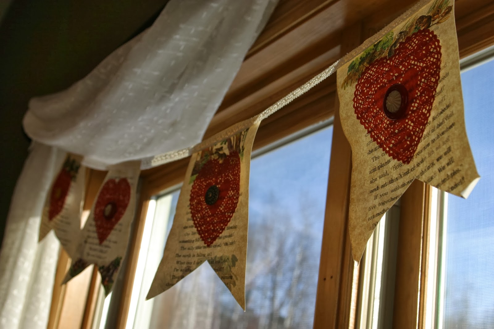 This garland was made last year as well, apparently I had a really crafty Valentine's last year! It was made very easily & inexpensively with red heart doilies, lace ribbon, old buttons and old pages from a distressed children's book. I love easy and simple DIY decor projects!